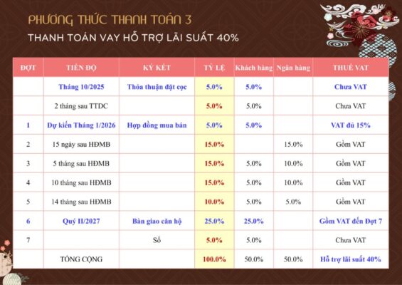 - Hỗ trợ lãi suất 0%/ 50% giá trị căn hộ đến khi nhận bàn giao