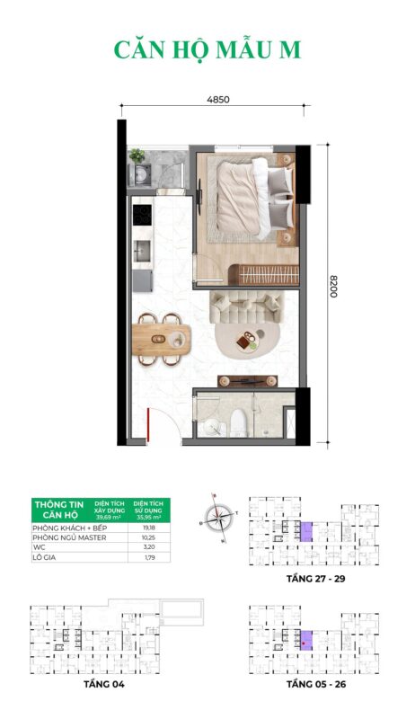 - Căn 1 phòng ngủ: 35m2 và 39m2